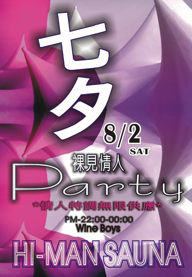 高雄-HI-MAN SAUNA 2014/ 8 / 2 -SAT 七夕情人派對 裸見Wine Boys Night 一年一次.每一次的相遇.. 盡在一句話的感動..祝福大家! 七夕情人節快樂... 活動時間-22:00-24:00 裸見Wine Boys Night <情人特調供應時間. ...